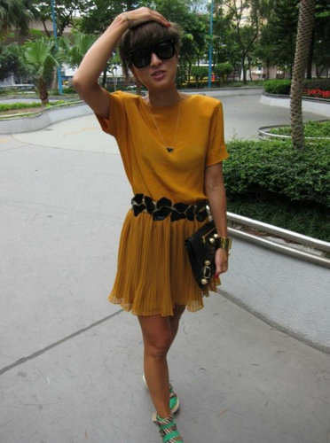 身穿一件姜黄色T恤,衬得整个人肤色更加白皙。搭配百褶半身裙,整体的黄色系给人眼前一亮的感觉。连衣裙及膝盖以上的长度也是妥妥的显高呀。