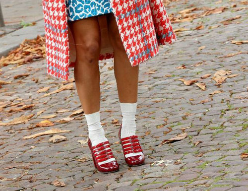红色的高跟鞋在色彩上和大衣交相呼应,不过搭配白袜子实在有点看不懂。不过这膝盖是怎么了?男人们看到都该怀疑人生了吧,真不知道陈奕迅每天咋熬过来的!