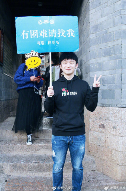 每到一处景点都拍照留念,还不忘比起剪刀手,被网友调侃跟大妈一致。董子健帅气手拿标语有困难找我,真是热心的小伙子 !