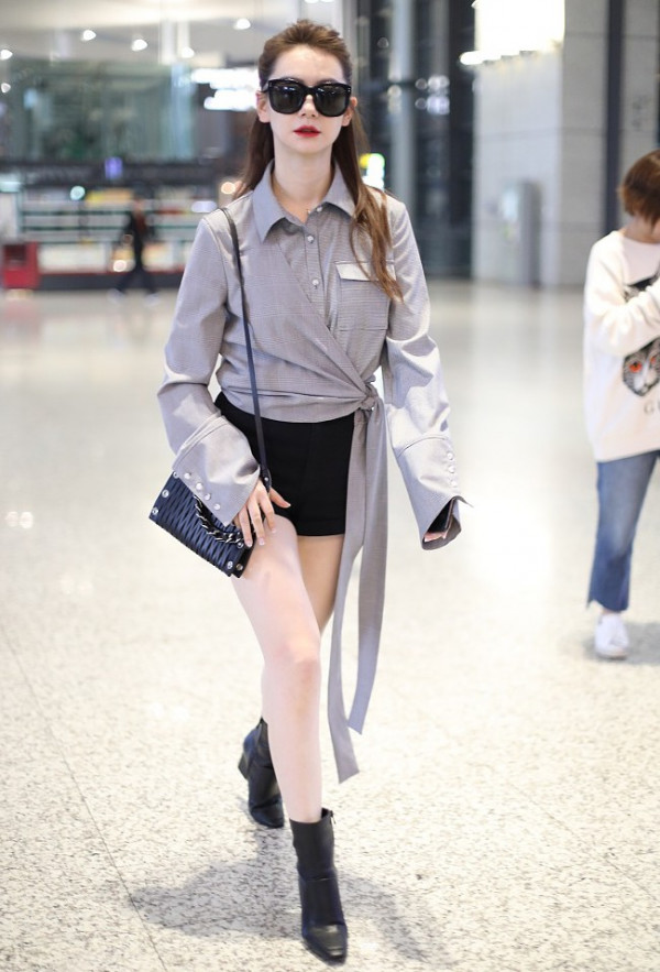 戚薇现身机场。当天她穿飘带衬衫秀长腿,展女王气场,机场煲电话粥,似与老公传情。