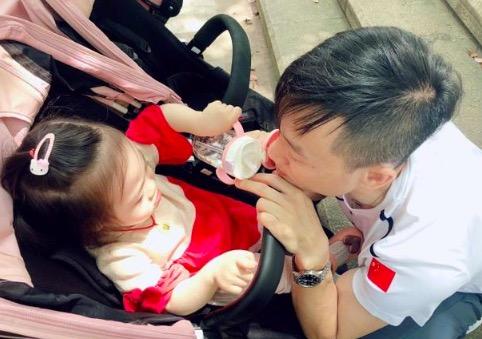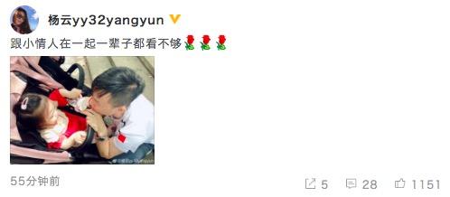 5月27日晚,杨云通过微博晒老公杨威深情对视女儿的温馨照片,并称:“跟小情人在一起一辈子都看不够!”照片中,女儿坐在婴儿车里,杨威蹲下身一脸温柔的看着女儿,而女儿对着爸爸嘟嘴撒娇,还把奶瓶递给爸爸喝,画面非常的温暖幸福。
