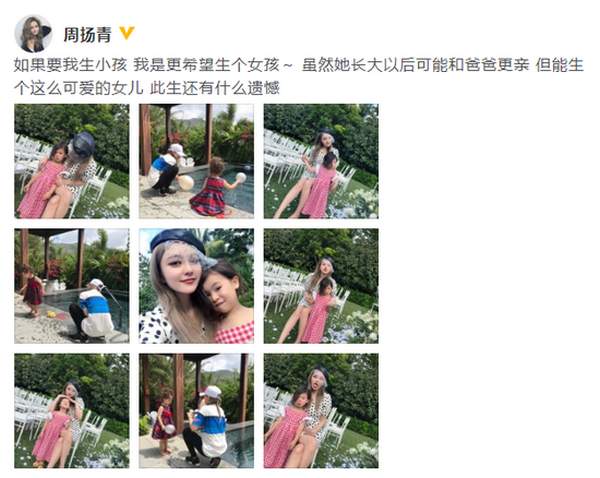 周扬青27日晚间晒出和小女孩一连串的自拍合照,和朋友的小孩还用流利的英文对谈,笑声听起来非常雀跃,看得出来很喜爱小孩子,她也同时在微博告白:“如果要我生小孩,我是更希望生个女孩~虽然她长大以后可能和爸爸更亲,但能生个这么可爱的女儿,此生还有什么遗憾。”