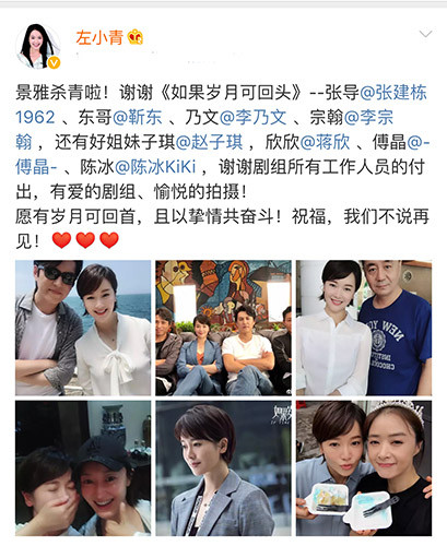 除了左小青自己po出一组合照之外,工作室平台也于稍后发出了现场的杀青视频,视频中左小青含泪告别现场工作人员,并与靳东、李乃文等现场人员拥抱互动,场面温馨,左小青本人也表示:这是个温馨、轻松的剧组,所有工作人员都简单却专业,这部剧值得期待。