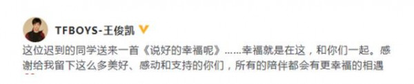28日,王俊凯在自己社交网站上传一段视频,并配文称:“这位迟到的同学送来一首《说好的幸福呢》……幸福就是在这,和你们一起。感谢给我留下这么多美好、感动和支持的你们,所有的陪伴都会有更幸福的相遇!”视频中,王俊凯身穿白色宽松T恤,坐在电子琴前,边弹边唱,歌声婉转动听。