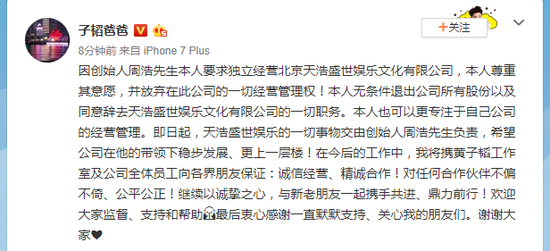 全文:因创始人周浩先生本人要求独立经营北京天浩盛世娱乐文化有限公司,本人尊重其意愿,并放弃在此公司的一切经营管理权!本人无条件退出公司所有股份以及同意辞去天浩盛世娱乐文化有限公司的一切职务。本人也可以更专注于自己公司的经营管理。即日起,天浩盛世娱乐的一切事物交由创始人周浩先生负责,希望公司在他的带领下稳步发展、更上一层楼!在今后的工作中,我将携黄子韬工作室及公司全体员工向各界朋友保证:诚信经营、精诚合作!对任何合作伙伴不偏不倚、公平公正!继续以诚挚之心,与新老朋友一起携手共进、鼎力前行!欢迎大家监督、支持和帮助?最后衷心感谢一直默默支持、关心我的朋友们。谢谢大家