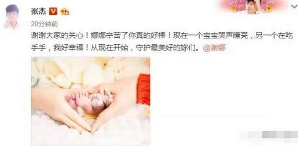 今年2月1日,谢娜产下一对双胞胎女儿,张杰随后晒出一家四口的照片并艾特谢娜说:“谢谢大家的关心!娜娜辛苦了你真的好棒!现在一个宝宝哭声嘹亮,另一个在吃手手,我好幸福!从现在开始,守护最美好的你们”。