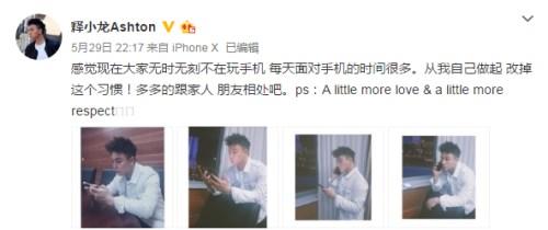 近日,青年演员释小龙在社交平台晒出一组照片,照片中释小龙身穿白色夹克,侧脸轮廓鲜明,显得帅气有型。仔细观察发现每张照片中释小龙都在认真把玩手机,于是自我批评:感觉现在大家无时无刻不在玩手机 每天面对手机的时间很多。从我自己做起 改掉这个习惯!多多的跟家人 朋友相处吧。ps:A little more love & a little more respect.
