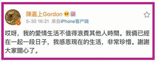 陈嘉上在微博回应恋情,感恩及珍惜现在的生活。