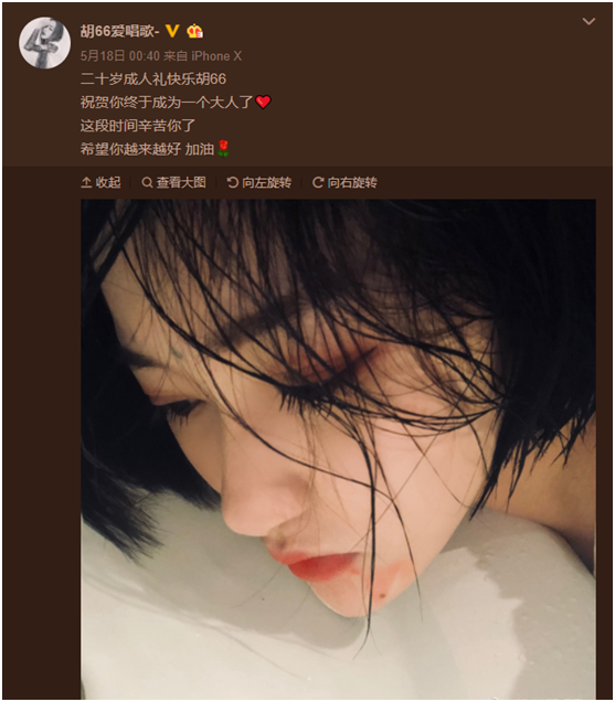 从当年不知名的酒吧驻唱到如今霸榜抖音的爆款歌手,胡66完成跨越的原因很难用一句唱歌好听概括。20岁生日那天,胡66在微博上祝贺自己终于成为了一个大人,“这段时间辛苦你了”。尽管放出的照片看起来精致,神色中还是不免流露出一丝倦意。的确,她刷爆了各个榜单,跑遍了能跑的演出,但背后付出的心血和坚持,可能大多数20岁的同龄人都难以想象。比起那些通过各种搞事情上热搜的“歌手”,相信一次次用作品冲榜的胡66会走得更远。