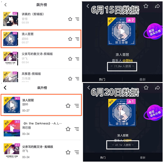 最近被抖音上的一首歌疯狂刷屏,就是酷狗歌手胡66于5月底发布的新作《浪人琵琶》。上线不满一个月时间,剪辑版已登顶抖音BGM飙升榜榜首,截至6月20日,使用人数已高达43万,相比一周前的数据翻了近四倍。