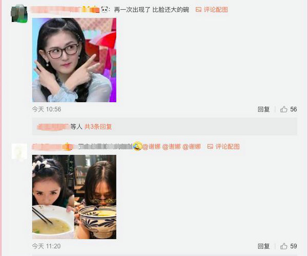 谢娜似乎不是第一次捧着一个比脸还大的碗吃饭了,有粉丝在微博评论里晒出了谢娜此前拿着大碗吃面的照片,还有粉丝调皮地提醒谢娜"马甲线"。