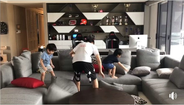 林志颖的大儿子Kimi已许久未露出正面,他过去曾透露:“希望Kimi能够回归正常求学生活,之后都不会让他在荧光幕前曝光。”因此近来只能看到双胞胎的萌照。他26日在社交平台分享一段日常“一打二”的影片,只见画面中,两个双胞胎儿子一左一右站在沙发上,不停的将抱枕丢到地上,他捡完Jenson丢的,换Kyson继续丢,他只好两边跑来跑去,玩起“你丢我捡”的游戏。