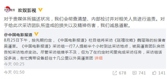 随后,欢娱影视转发该长文,回应称会彻查清楚,内部检讨并对相关人员进行追责,也向采访团队道歉。