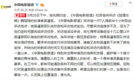 《中国电影报道》称8月25日下午,栏目组按约定采访《延禧攻略》魏璎珞的扮演者吴谨言。采访组提前半小时到采访地点,结果被吴谨言团队通知要换地方,随后又被要求付场地费。而吴谨言团队更称因为还有别的安排,没时间满足采访的内容。栏目组还表示从艺路上任重道远,德为先,希望这是第一次,也是最后一次。