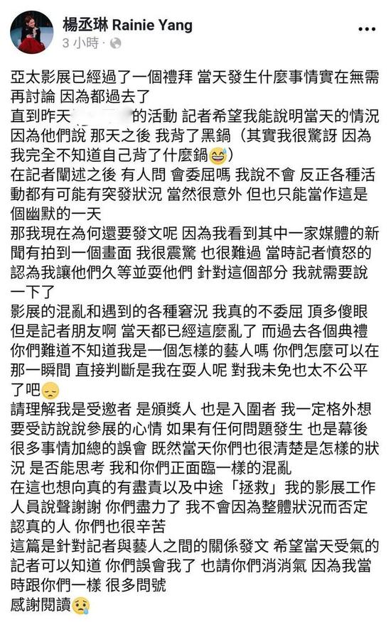 杨丞琳据港媒,近日,杨丞琳出席亚太影展,被传让记者久等,不接受访问,9月8日出席活动被问及此事才知自己背锅。9日,杨丞琳再次发文回应:“当天现场混乱,影展工作人员并未告知有访问,且自己参加影展肯定想发言,一切都是误会,希望大家不要凭一瞬间就判定结果。”
