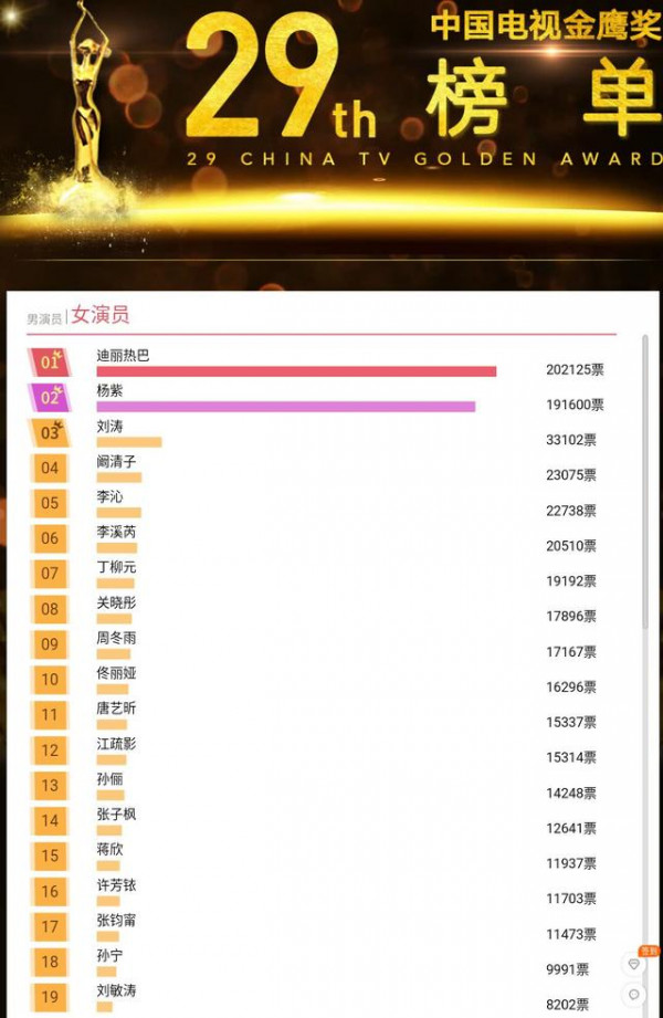 2018金鹰节投票已经打响,而这一阶段金鹰奖女演员迪丽热巴和杨紫竞争非常的激烈,从目前的情况来看,迪丽热巴以202125票领先,而杨紫以191600票紧跟其后,而其他艺人就比较少了,票数基本都没有过4万,看来这一次的投票非迪丽热巴和杨紫莫属了,虽然相差1万多票,但是杨紫现在的增长明显比较猛,最后鹿死谁手还不一定。