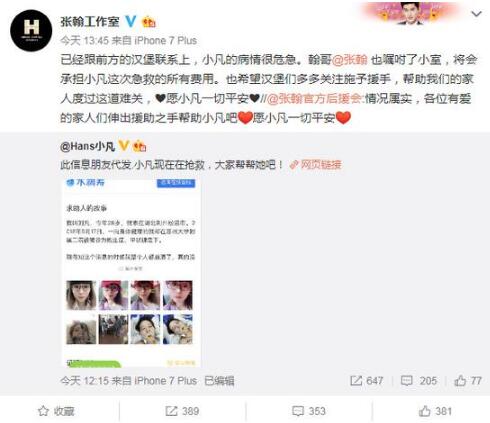 张翰工作室转发微博称:“已经跟前方的汉堡联系上,她的病情很危急。翰哥也嘱咐了小室,将会承担她这次急救的所有费用。也希望汉堡们多多关注施予援手,帮助我们的家人度过这道难关,愿一切平安!”