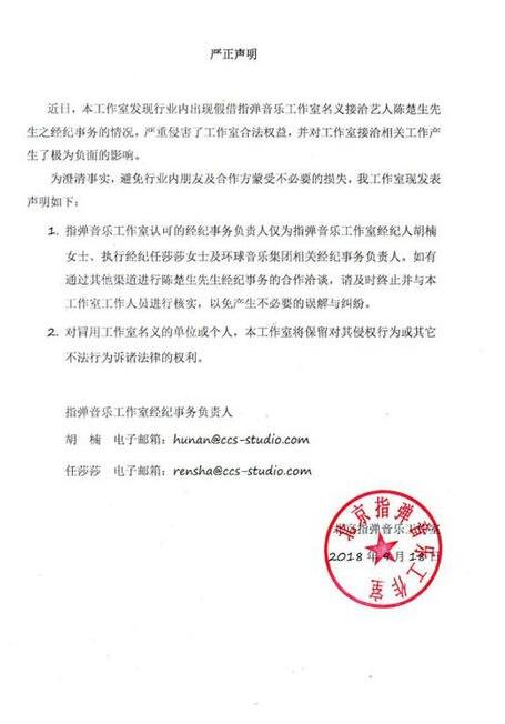 声明还称:“若有通过其他渠道进行陈楚生先生经纪事务的合作洽谈,请及时终止并与本工作室工作人员进行核实,以免产生不必要的误解与纠纷。”