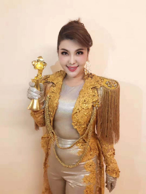 时尚的包肩流苏金色小礼服,使乌兰图雅星光熠熠,金色的奖杯与礼服上金色的花瓣交相互应,乌兰图雅婉若金花光芒四射,在颁奖舞台上刮起了浓浓的国际流行风。