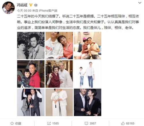 20日零点整,冯远征晒出与太太梁丹妮的合照庆祝25周年银婚,并称:“二十五年的今天我们结婚了。听说二十五年是银婚。二十五年相互陪伴,相互依赖。事业上我们扮演人间群像,生活中我们是丈夫和妻子。认认真真是我们对事业的追求,简简单单是我们对生活的态度。我们是伴儿,陪伴、相伴、老伴。 ”