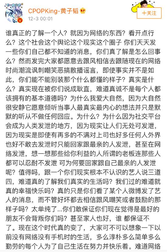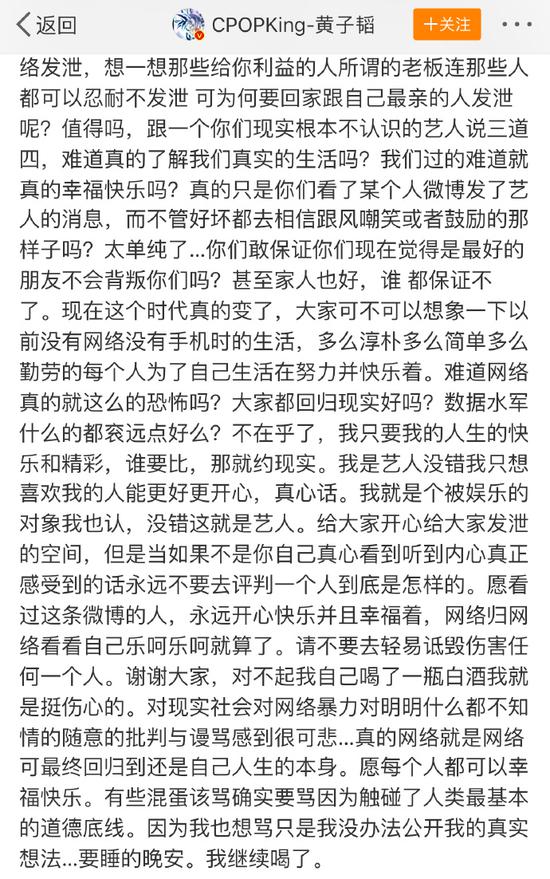 黄子韬微博全文:谁真正的了解一个人?就因为网络的东西?看开点行么?这个社会这个舆论这个现实这个圈子 你们天天发一些你们自己都不知道的消息,你们真了解是怎么回事么?然而发完大家都愿意去跟风相信去跟随现在的网络时尚潮流讽刺嘲笑恶搞散播谣言,即使事实并不是如此,你们能不能别装那个什么都懂的样子?真实是什么?真实现在被你们说成耿直,难道真诚不是每个人都该拥有的基本道德吗?为什么我爱大自然,因为大自然很安静它愿意倾听当事人最真实最内心的想法并只是默默的听从不做任何回应。为什么?为什么因为社交平台会成为人类发泄的地方,因为现实让人们无处可发泄,因为现实是即使有再多的不满对上司也好多任何人外界也好不敢去发泄时只能回家跟最亲的人发泄,甚至在网络发泄,想一想那些给你利益的人所谓的老板连那些人都可以忍耐不发泄 可为何要回家跟自己最亲的人发泄呢?值得吗,跟一个你们现实根本不认识的艺人说三道四,难道真的了解我们真实的生活吗?我们过的难道就真的幸福快乐吗?真的只是你们看了某个人微博发了艺人的消息,而不管好坏都去相信跟风嘲笑或者鼓励的那样子吗?太单纯了…你们敢保证你们现在觉得是最好的朋友不会背叛你们吗?甚至家人也好,谁 都保证不了。现在这个时代真的变了,大家可不可以想象一下以前没有网络没有手机时的生活,多么淳朴多么简单多么勤劳的每个人为了自己生活在努力并快乐着。难道网络真的就这么的恐怖吗?大家都回归现实好吗?数据水军什么的都衮远点好么?不在乎了,我只要我的人生的快乐和精彩,谁要比,那就约现实。我是艺人没错我只想喜欢我的人能更好更开心,真心话。我就是个被娱乐的对象我也认,没错这就是艺人。给大家开心给大家发泄的空间,但是当如果不是你自己真心看到听到内心真正感受到的话永远不要去评判一个人到底是怎样的。愿看过这条微博的人,永远开心快乐并且幸福着,网络归网络看看自己乐呵乐呵就算了。请不要去轻易诋毁伤害任何一个人。谢谢大家,对不起我自己喝了一瓶白酒我就是挺伤心的。对现实社会对网络暴力对明明什么都不知情的随意的批判与谩骂感到很可悲…真的网络就是网络可最终回归到还是自己人生的本身。愿每个人都可以幸福快乐。有些混蛋该骂确实要骂因为触碰了人类最基本的道德底线。因为我也想骂只是我没办法公开我的真实想法…要睡的晚安。我继续喝了。