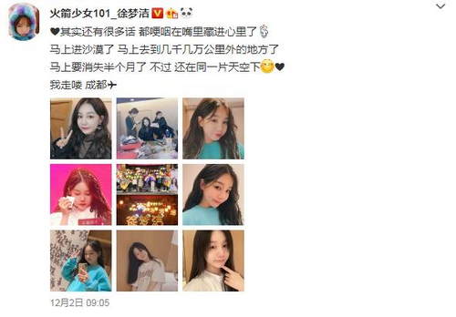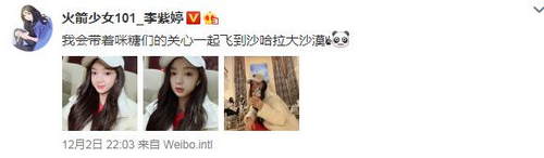 据了解,火箭少女101将出发前往沙漠录制团综,多位成员也发文与粉丝互动。