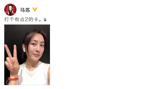2月25日晚,马苏通过微博晒素颜自拍照,自侃道:“打个有点2的卡。”照片中,马苏扎着低马尾,一脸素颜,皮肤光滑细腻,对镜比着剪刀手,身着白色无袖背心,脖子上挂着汗珠,看样子是刚做完健身。