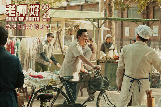 此前发布的预告片中,于谦饰演的苗宛秋正言厉色,被学生们称为“苗霸天”。此次曝光的剧照却出展现苗老师慈祥、和蔼的一面。推着自行车与旁人微笑交谈、与学生欢聚一堂吃饭聊天,相比课堂上的严肃认真,课后的苗老师则更加平易近人。黑框眼镜、朴素的衬衫、手腕上带着手表,一身复古装扮的于谦还原了八十年代老师们的形象,与学生们的有爱互动勾起不少网友的回忆,并直言:“好像是我们那个时候的真实记忆。”