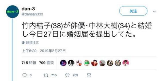 2月27日,有海外媒体爆料竹内结子与演员中林大树结婚,今天27日提交了结婚申请书。所属事务所称是前后辈关系,以家庭为单位进行交往的期间,关系发生了变化。