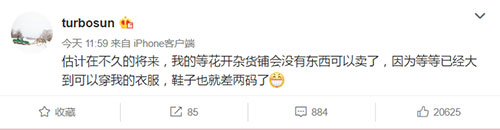 4月9日上午,孙俪发文表示:估计在不久的将来,我的等花开杂货铺会没有东西可以卖了。因为“等等已经大到可以穿我的衣服,鞋子也就差两码了。” 粉丝纷纷留言感慨:“我的天等等长得这么快吗?”、“等等都这么高了吗!”