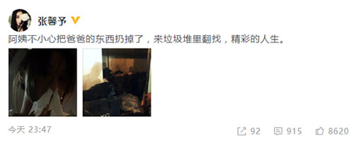 4月9日晚,张馨予在社交平台上晒出一张搞笑自拍,并无奈写道:“阿姨不小心把爸爸的东西扔掉了,来垃圾堆里翻找。”照片中,灯光昏暗,她头发随意扎在脑后发丝散乱,用两团纸巾塞在鼻孔中表情无奈。她还晒出一张垃圾堆的照片,感慨道“精彩的人生!”