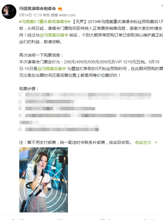 5月20日冯提莫的首场演唱会即将开票,冯提莫本人通过微博也是在不断地倒计时预告,但是5月17日,有网友爆料称冯提莫的演唱会最高票价竟高达1219元,堪比很多一线歌手惹争议。