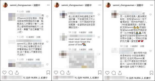不过,不少郑秀文的粉丝也留言维护许志安,认为郑秀文已原谅了许志安,其他人就不应再加意见。有歌迷指:“老公到场支持老婆是正常不过的事,不到场支持又可以说他无情,你不原谅许志安不重要,老婆原谅他对他来说已足够。”