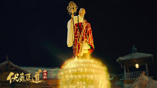 影片开头上古邪妖“一目五”屠尽村民,吸纳人间精元之时,降妖僧大痴和尚赶来,妖僧对峙斗法火花四溅,能将人瞬间灰飞烟灭的“一目五”妖杖不断涌出邪恶妖灵,另一边,降妖僧九环锡杖上的金环在他徐徐诵经之时凝聚成特殊的力量笼罩在黑暗邪灵的四周,形成金钟罩锁死“一目五”,一招一式之间动作一气呵成,大痴和尚潇洒沉着的气势和高超的降妖技能使其顺利将“一目五”镇压于金钟之下化为五面石像,从此换来人间二十年和平。