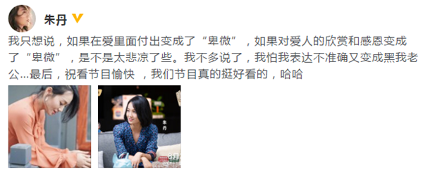 此前,在综艺节目《做家务的男人》中,朱丹分享了丈夫周一围处理冷战的方式,引起很大的争议。朱丹此次发微博,强调夫妻之间的付出不等于卑微,也害怕自己表述不当再引争议,希望观众们看节目看得愉快。