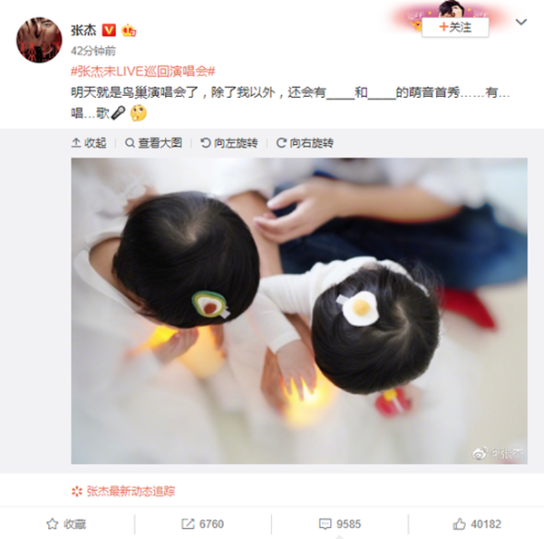 8月9日,张杰在微博上分享女儿跳跳俏俏的萌照,并称:“明天就是鸟巢演唱会了,除了我以外,还会有____和____的萌音首秀……有…唱…歌。”照片中,跳跳俏俏露出圆圆的小脑袋,夹着牛油果和太阳蛋夹子,萌力爆表。