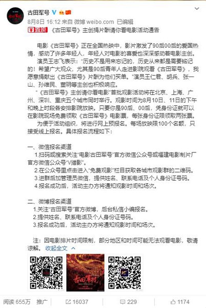 据悉,“《古田军号》主创请你看电影”首批观影活动将在北京、上海、广州、深圳、重庆五个城市同时举行,采取线上报名的形式。观影时间为8月10日、11日的下午和晚上时段各安排影院放映。90后、00后观众凭身份证可以在影院现场免费领取《古田军号》电影票。现观影活动正在如火如荼地进行当中,观众参与热情高涨,线上领票情况异常火爆。