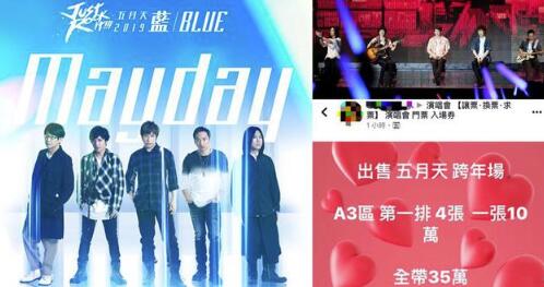 9月30日消息,据香港媒体报道,五月天宣布将于12月21日起在桃园国际棒球场举行10场《Mayday 2019-2020 Just Rock It!!!“蓝 | BLUE”》巡回演唱会,跟粉丝一同跨年迎接2020年。演唱会门票前天开始发售,共计10场、20万张门票在短短9分钟内售罄,不少粉丝都不能成功抢票。有黄牛党趁机炒高票价牟利,据知跨年场A3摇滚区票价为4880台币一张,黄牛票竟炒高至10万台币一张,涨幅超过20倍。有黄牛党在网上发文:“出售五月天跨年场,A3区第一排4张,一张10万,全带35万。”网友也被这天价吓到,留言:“这太佛心价了,不推不行,推给警察来抓”、“哇,抢到省一点,整年都不用工作”。