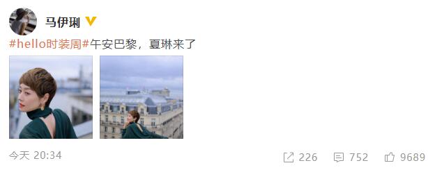 9月29日晚,马伊琍通过社交平台晒出性感美照,并配文写道:“午安巴黎 !”照片中,马伊琍依然一头短发,身穿黑色紧身裙配墨绿色雪纺露背衬衫,尽显好身材,妆容精致,皮肤白皙,笑容甜美灿烂,知性优雅,女人味十足。