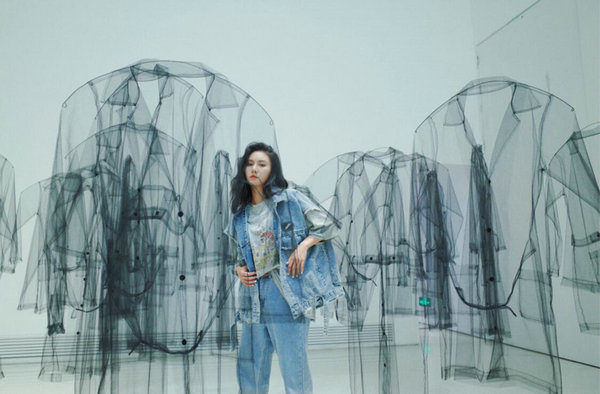 写真里黄柳嫣时而站在群立的黑色纱衣之中,时而将自己掩于纱后,不变的是酷女孩的模样。磨边牛仔夹克增加了野性的肆意心性,马丁靴在浅色系搭配下不显厚重,反而增加了强势的魄力感,散下的披肩长发搭配玫红色红唇,又简单点缀了神秘的气息。