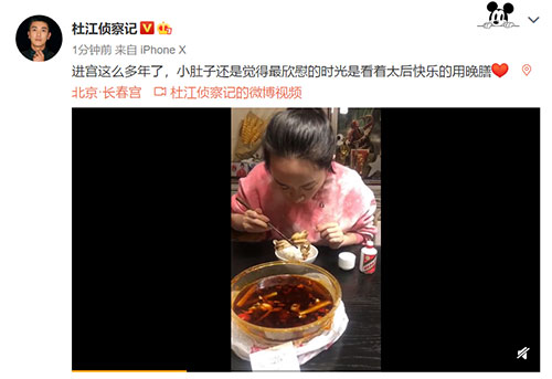 11月4日晚,霍思燕老公杜江更新了微博动态,晒出一段霍思燕享受美食的视频,杜江附文写道:进宫这么多年了,小肚子还是觉得最欣慰的时光是看着太后快乐的用膳。