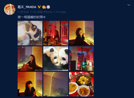 近日,演员葛天在网上晒出了一组初雪美照,配文:“赏一场温暖的初雪。”葛天身穿一件黑色T恤,一头秀发乌黑浓密,在室内灯光的照耀下,画面显得十分的唯美、温暖。