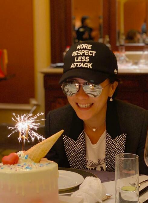 照片中的她戴着黑色鸭舌帽和银色墨镜,身穿黑色西装看起来温婉端庄,目光注视着满满少女心的粉色蛋糕,笑容非常灿烂,尽显幸福感。