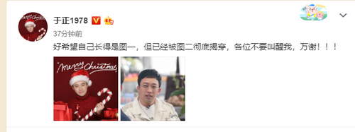12月25日,编剧于正在个人社交平台上晒出圣诞精修头像和现实生图,两张图对比后五官差距较大,判若两人。