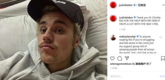 1月23日,比伯在个社交网站晒出自拍,发文着重感谢了自己的医生,表示这位医生为他的皮肤提供了帮助,帮助了他很多。照片中,比伯戴着一顶黑色帽子,穿着灰色卫衣躺在床上,状态看起来很好。