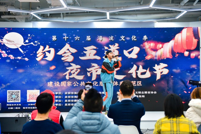 “火车就要开过来了,请不要抢行,不要翻栏杆……”,夜幕降临,华灯初上,12月22日晚,海淀区五道口西街一号学院路街区规划馆现场人声鼎沸、门庭若市,神思乐队演奏原创歌曲《五道口》揭开了第十六届海淀文化季“约会五道口”夜市文化节的序幕,来自学院路地区的青年人们齐聚“宇宙中心”,约会冬至日。