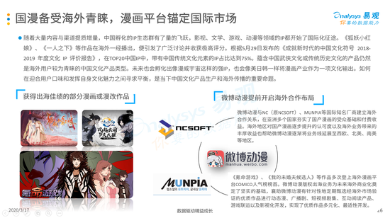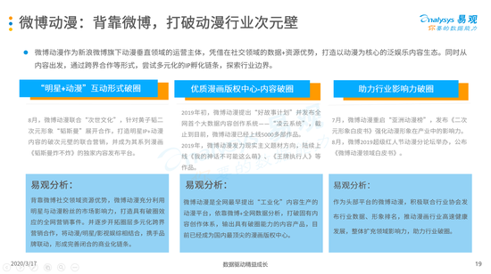 3月16日,大数据公司易观发布《2020中国互联网漫画市场年度分析》,揭示互联网漫画行业的诸多利好:活跃用户年增长超过30%,且仍然拥有较大发展空间。其中,微博动漫作为头部平台,上线仅2年发展极快,依靠微博释放多元内容的商业化潜力,最值得关注。