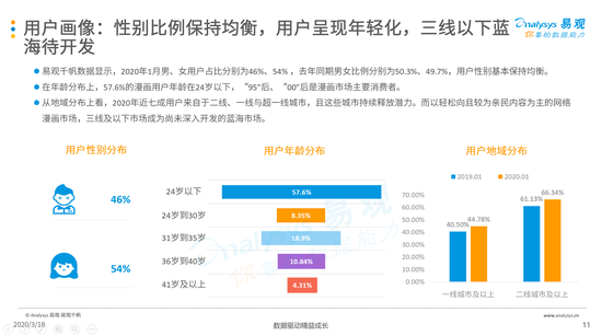 报告指出,随着市场发展,中国互联网漫画产业正在迎来新一轮利好。在政策方面,“十三五”规划中对于动漫相关产业发展的支持,显示出其已成为未来中国市场最重要的文化产业之一。在用户付费方面,互联网漫画APP已经开始承担用户多种需求,用户的付费意愿和能力持续提升。2020年1月数据显示,漫画APP中高消费者占比1/4,对比去年同期,低消费用户下降近5个百分点。在用户结构方面,2020年近七成用户来自于二线、一线与超一线城市,且这些城市持续释放潜力。而以轻松且较为亲民内容为主的网络漫画市场,三线及以下市场成为尚未深入开发的蓝海市场。
