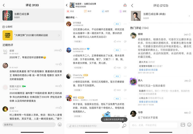 荣迷在QQ音乐、酷狗音乐、酷我音乐三大平台哥哥的歌曲评论区,留下了他们萦绕心怀的多年情愫。“在每一个《春夏秋冬》里想你,在风触碰指尖的时候想你,在每一个平凡无聊的日子里想你,在看见温暖的回头微笑的时候想你。”相信QQ音乐用户Zero的留言也触动了很多荣迷的心;酷狗用户Chanrichy:“小楼依旧当年貌,世间已无程蝶衣。笙乐仍奏破娄音,芸生不见张国荣”的评论更是俘获了很多网友的点赞支持;酷我粉丝“与你”也在评论区留言道:“忘了你却太不容易。”