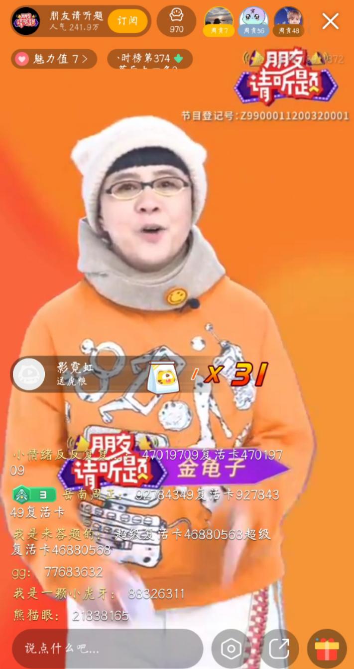 最近这个社群操作的就是虎牙正在热播的一个叫做《朋友请听题》益智互动答题节目。由于奖池比较丰厚,同时题目难度相对来说较低,社群迎来了史无前例的人气高潮,近百个社群同时在线答题,场面无比壮观,群主超高“吃鸡率”,不出意外,社群成员会一站到底,取得最后奖金,这也就是为什么大多数人不能把把吃鸡的原因。